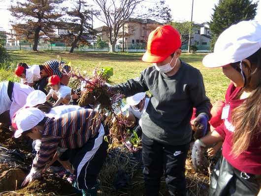 11月14日(金)、1・2年生がサツマイモほりをしました。5月上旬に、地域の方に整備(耕し、うねづくり、マルチはり)していただいた畑に苗を植えてから半年、土の中にはサツマイモが立派に育っていました。手にするたびに、あちこちで歓声があがりました。1年生は、残ったいものつるでリースづくりもしました。天候にも恵まれ、楽しい体験をすることができました。