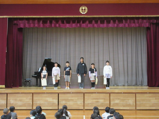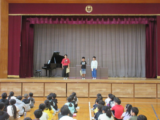 10月10日(金)朝の活動の時間に、受賞者紹介・前期終業式を行いました。紹介した内容は以下のとおりです。 ・第20回旭市児童生徒科学作品展覧会 優秀賞 ・旭市読書感想文コンクール 特選 佳作 また、前期終業式では、校長先生の話があり、前期の様子を振り返ってまとめました。終業式後には、各学級で担任から児童へ通知表を渡しました。