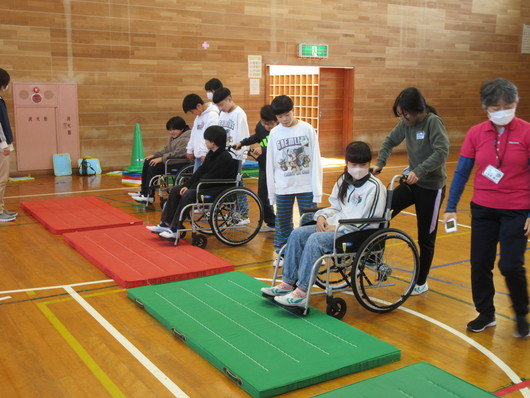 介護キャラバン隊車いす体験の様子 11月21日(金)4時間目に、介護キャラバン隊をお招きし、講話と体験を行いました。5年生を対象に行われ、車いす体験を通して、介護や福祉に関する理解を深めました。体験では、小さな段差でも、車いすでは乗り越えるのが難しいということを実感し、配慮しながら車いすを押そうとしていました。 |