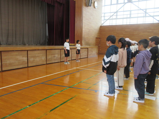 陸上部結団式部長・副部長挨拶の様子 4月10日(金)昼休みに、陸上部結団式を行いました。今年度も、4〜6年生が陸上部として活動し、5月13日(水)に行われる旭市小学校体育大会に向けて練習に励みます。結団式では、部長・副部長が紹介され、陸上部の活動への決意を表明しました。 |