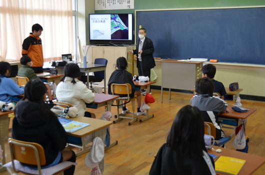 12月11日、4年生の社会科の授業で、前旭市教育委員の鏑木先生に「干潟八万石の歴史−椿海の干拓−」に関する授業をしていただきました。 スライド資料や動画を使い、干拓前のこの地域の様子や辻内刑部左衛門、鉄牛、野口初太郎といった現在の干潟八万石を築くために大きく貢献した人々のお話をしていただくなど、郷土のことがよくわかる内容でした。4年生は今回の授業を生かし、学習を進めていきます。 鏑木先生、お忙しい中ありがとうございました。