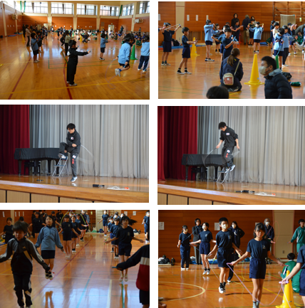 12月18日古城小学校で、プロ縄跳びプレイヤーの黒野寛馬さんを講師として招き、合同縄跳び教室を実施しました。この日は、3校が1〜3年と4〜6年に分かれて集まり、全校が重なる時間に講師の先生のパフォーマンスを鑑賞しました。実技指導では、飛び方についてよい例と悪い例を実際に示し、子どもたちにわかりやすく教えていただきました。この体験を生かし、縄跳びを使った体力づくりや技能の向上に努めていきたいと思います。