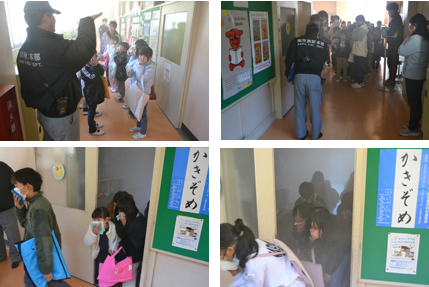 1月26日、避難訓練及び煙体験を実施しました。この日は体育館で全校集会をしている中、左手前方に設置してあったストーブから出火したとの想定で訓練を行いました。全員、落ち着いて避難することができました。 訓練後に、旭市消防本部干潟分署の署員の皆様の指導のもと、煙体験を行いました。今回の体験でも前が見えずに大変でしたが、実際の火災はこれ以上の激しさで、とにかく姿勢を低くして移動することが大切だと教えていただきました。 干潟分署の皆様、お忙しい中ありがとうございました。