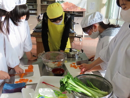 12月9日(火)に、5年生が、食農推進事業で農水産課と食育アドバイザーの方に、おにぎりとお味噌汁の作り方を教えていただき、調理実習をしました。調理の合間には、旭市が全国有数の野菜生産地であることについて学び、有意義な活動を行うことができました。