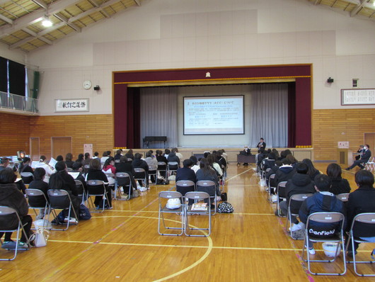 本校では1月29日、令和8年度入学予定児童・保護者の皆さまを対象とした新入生説明会を開催しました。 当日は寒い中、多くの皆さまにご来校いただき、会場はこれから始まる学校生活への期待と緊張が入り混じった、温かな雰囲気に包まれていました。説明会では、まず校長より本校の学校概要についてお話しし、その後、生徒指導担当より学校生活のルールや安全面への取り組み、養護教諭による健康に関することなど、入学後の生活をイメージしやすい内容をお伝えしました。また、千葉県警察本部少年課北総地区少年センターと旭市教育委員会の方々を講師にお招きしSNS安全教室と部活動地域移行についてもお話しをしていただきました。