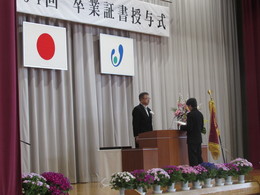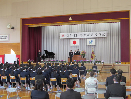 本日、令和7年度「第54回卒業証書授与式」を挙行いたしました。 厳粛な雰囲気の中、担任の呼名に元気よく応える卒業生の姿は、これまでの成長を感じさせる大変立派なものでした。証書を受け取る一人ひとりの瞳には、未来への希望が満ちあふれていました。 これまで本校の教育活動を温かく支えてくださった保護者の皆様、地域の皆様に心より感謝申し上げます。