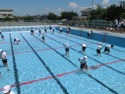 6月7日(水)、5・6年生がプール掃除を行いました。 5年生は主にプールサイドを、6年生はプールの中を掃除しました。 バケツで水をかけながらブラシで壁面をこすりながら行いました。 業間と3校時の予定でしたが、6年生が4校時も残ってきれいに仕上げをしてくれました。 暑い中でしたが、児童は進んで取り組んでいました。