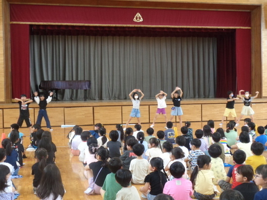 6月27日(火)、体育館で全校集会を行いました。内容は、6月29日(木)から7月1日(土)までの3日間、沖縄県中城村との交流事業に参加する5年生児童10名の壮行会です。中城村での交流会で披露する、旭市にまつわるクイズや旭音頭(サンババージョン)が全校児童の前で発表されました。校長の激励の話の後は、全校児童からの「いってらっしゃい。」に「行ってきます。」と元気な声でしめくくられました。短時間でしたが楽しい集会となりました。