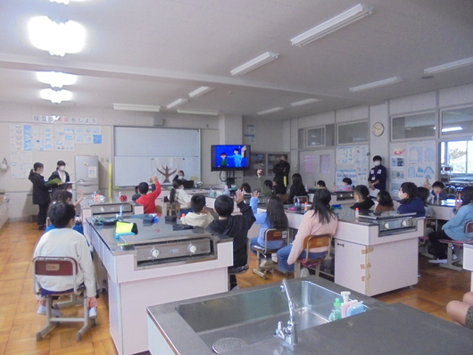 2月2日(金)、4年生が「認知症サポーター養成講座」に参加しました。これは、県の健康福祉部高齢者福祉課認知症対策推進班の事業で、認知症に関する正しい知識を学ぶことを目指しています。児童は、まず、パワーポイントのスライドで、認知症に対する正しい理解や認知症の方への正しい接し方についての説明を受けました。その後寸劇を見て、学んだことを○×クイズ形式で答えながら確認しました。最後に、黒板に貼られた「思いやりの木」の掲示物に、感想などを書いた用紙を貼って講座のまとめをしました。お土産に「認知症サポーターキャラバン」の証であるオレンジのブレスレットをいただきました。ご来校のみなさまありがとうございました。