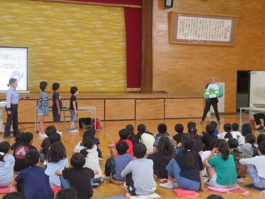 5月23日(木)、不審者対応訓練を実施しました。講師には、千葉県警北総地区少年センターより3名の方をお招きして行いました。3校時には低学年が「いかのおすし」を中心に、登下校中など学校外で不審者にあったらどうするかについて学びました。4校時には高学年も「いかのおすし」を合い言葉に、不審者の見分け方について学びました。また、防犯ブザーをランドセルのどこにつけるのかや万一の際に「助けてえー!」と大声を出す練習等も行いました。中身の充実した訓練となりました。