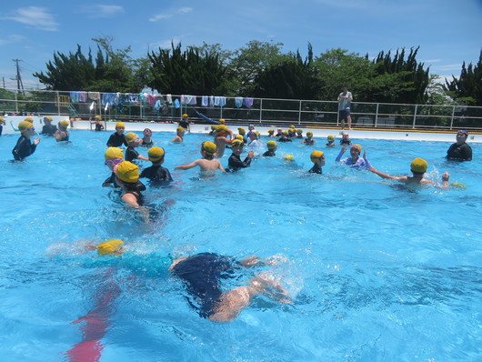 6月24日(月)、今シーズン初の水泳学習がありました。気温29℃、水温26℃で実施可のコンディション。今日プールに入ったのは5年生と2年生でした。入念な準備運動をして体をあたためた後、シャワーを浴びてからプールサイドに腰掛けて水慣れの準備をしました。笛の合図で、プールのへりをつかんで後ろ向きにゆっくりとプールの中へ。今年はじめての水泳学習でしたがすべり出しは順調で、いいスタートがきれました。