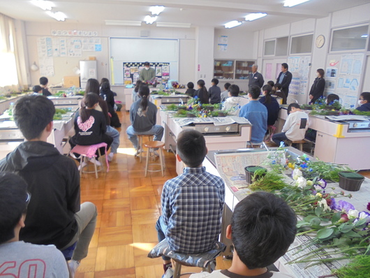 花卉教室12月2日(火)、6年生を対象に「花卉教室」が行われ、フラワーアレンジメントを体験しました。旭市花卉生産者協議会の主催で、児童に花を身近に感じてもらうことで豊かな心を育てたいという目的のもとに行われました。完成した素敵な作品を手に、児童は皆うれしそうに帰っていきました。ご来校の皆様ありがとうございました。 |