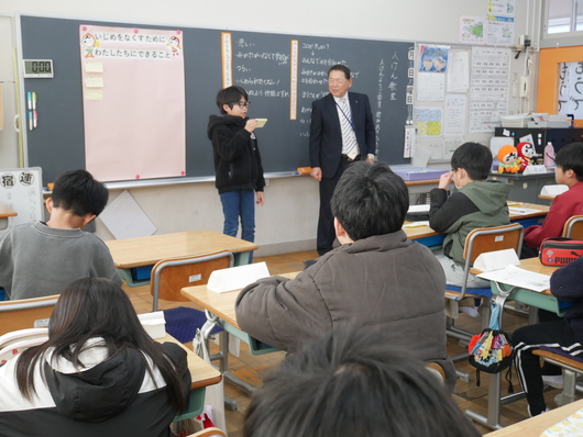 人権教室1月13日(火)、4年生を対象に「人権教室」を行いました。「いじめ」に関わる動画を視聴した後、「いじめをなくすために自分たちができること」について考え、自分の考えを発表しました。児童一人一人が、相手の気持ちを大切にすることや、周りと協力することの大切さに気付き、真剣に学ぶ姿が見られました。 |