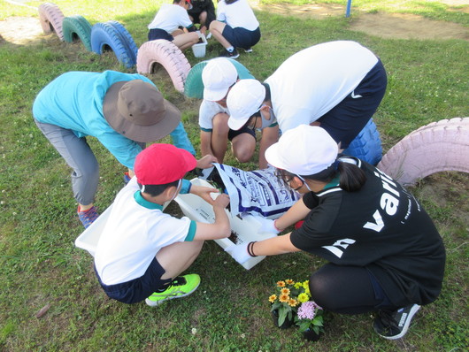 5月24日(水)6年生が花の寄せ植え体験を行いました。コメリパワー旭店より3名が来校し、6年生を対象に寄せ植えの指導をしてくださいました。土の入れ方や花の植え方など、ひとつひとつ丁寧に教えてくださいました。楽しく植えられ、植えた後はすぐさま水やりをして児童昇降口に飾りました。ご指導ありがとうございました。