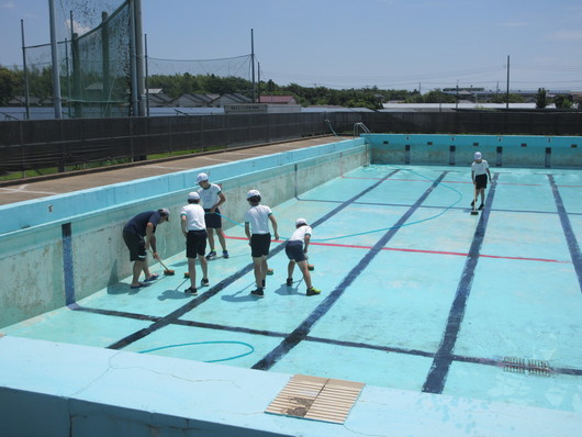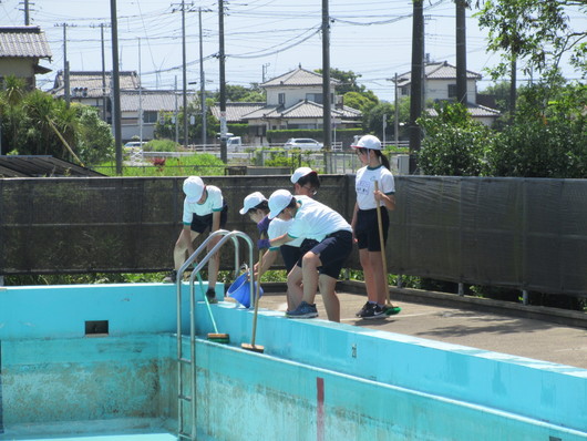 6月11日(火)2校時目に5・6年生でプール清掃を行いました。プール内のブラシ掛けやプールサイドの枯れ葉集め、トイレ掃除などを中心に行いました。6月25日(火)にプール開きを実施し、水泳学習を開始する予定です。