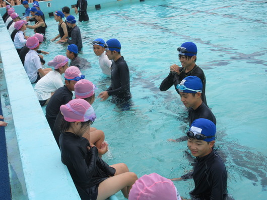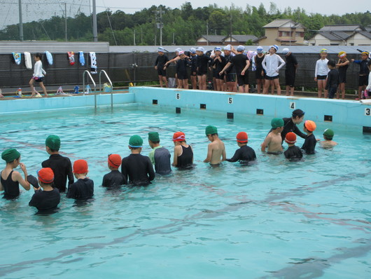 6月25日(火)3・4校時に、プール開きを行いました。プールのお清めや、体育委員会による水泳学習のルール確認を行った後、1・6年生、2・5年生、3・4年生でプールに入りました。水慣れとして、水を体にかけたり、プールの中を歩いたりしました。