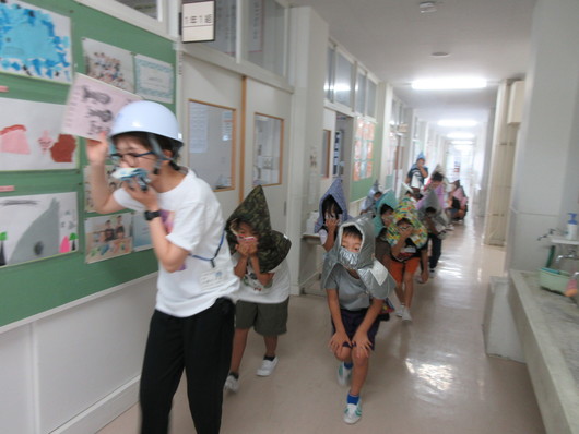9月3日(火)2校時に、火災を想定した避難訓練を行いました。児童はハンカチで鼻や口を覆ったり、姿勢を低くしたりして避難しました。また、不明者の捜索・救助の訓練も行いました。