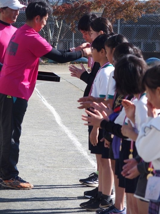 校内マラソン大会6年生の様子 ![]() メダル授与の様子 12月3日(火)午前中に校内マラソン大会が開催されました。天候にも恵まれ、1・2年生は大会コースを3周(約750m)、3・4年生は4周(約1000m)、5・6年生は5周(約1250m)を走りました。各学年練習の成果を発揮し、一生懸命に走り抜くことができました。 |