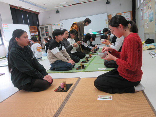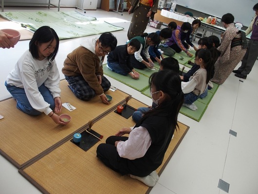 茶道教室![]() 5年生の様子 6年生の様子 12月5日(木)2校時に5年生、3校時に6年生を対象とした茶道教室を行いました。3名の講師の方々から、礼儀作法やお茶の点て方、茶道の歴史などを学びました。「難しかったけど、おいしかった。」「正座するのが大変だった。」などの感想がありました。 |