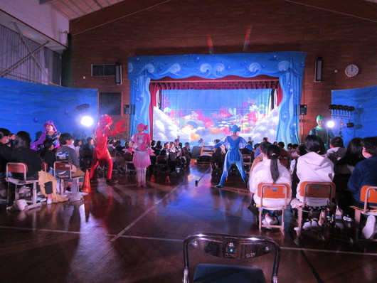 芸術鑑賞会鑑賞の様子 12月12日(木)3・4時間目に芸術鑑賞会を行い、夢団さんによるミュージカル『虹色サンゴ』を鑑賞しました。プロジェクションマッピングを使用した劇を鑑賞し、児童からは「本当の海みたいだった。」「命の大切さを実感した。」などの感想がありました。 |