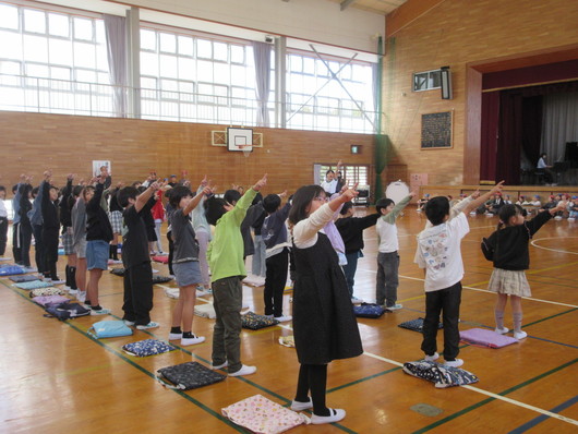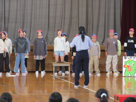 10月28日(火)昼休みに、音楽集会を行いました。1〜4年生は、「ひょっこりひょうたん島」を歌唱し、かわいい振り付けとともに発表しました。5・6年生は、翌日の旭市小学校音楽会で発表する「冒険者」「怪獣のバラード」を歌唱し、手作りの小道具や楽器を用いて、冒険をテーマとした世界を作り上げていました。