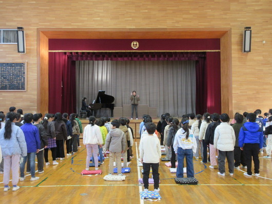 1月6日(火)1校時に全校集会がありました。新年最初の全校集会では、校歌斉唱の他、校長から次の学年に向けての準備について話がありました。