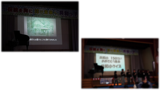 低学年によるダンスや、高学年の合唱等、様々な出し物が行われ、大盛り上がりでした。また、保護者の方だけでなく、地域の方もお招きして、歴代の卒業アルバムや展示品、歴史を振り返るスライドを見て、共和小の歴史をなつかしむ姿も見られました。