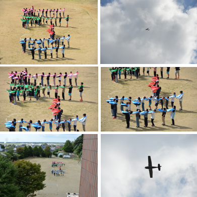 10月10日、市制20周年記念の航空写真撮影がありました。全校で色とりどりのカラーエプロンを着け、「まんざい」の文字を形作りました。どのような写真ができあがるのか楽しみです。