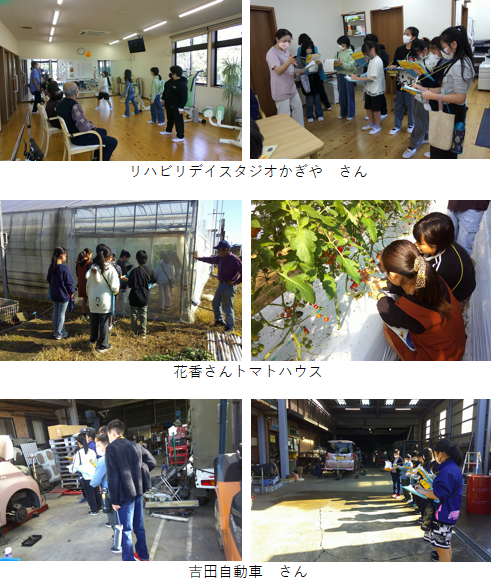 11月7日、5・6年生はキャリア教育の一環として、学区の3つの事業所等に職場訪問に行ってきました。 今回はお世話になったのは、リハビリデイスタジオかぎやさん、花香さんのトマトハウス、吉田自動車さんです。どの訪問先でも、職場(施設)の様子を見学させていただいたり、丁寧に質問の答えてくださったりと、お忙しい時間にもかかわらず温かく対応していただきました。 かぎやさん、花香さん、吉田自動車さん、子どもたちのためにありがとうございました。