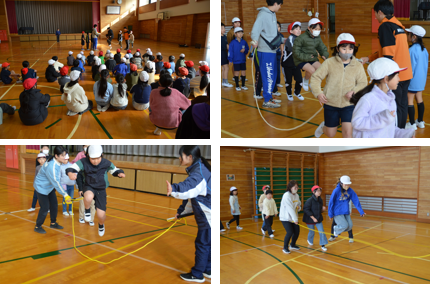 1月20日から毎週火曜日の業間の時間に、全校で縄跳びの活動がスタートしました。具体的には、低・中・高のそれぞれの学年に分かれて8の字跳びを行っていきます。この日は初日ということもあり、1年生と6年生、2年生と5年生が一緒に行い、跳び方について確認をしました。今後、3分間でどれだけ跳べたか記録の向上を目指して取り組んでいく予定です。また体育の時間には、個人の目標を決めて様々な技を練習していきます。