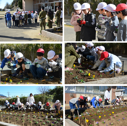 1月22日、旭農業高校の生徒さんと先生方を招き、1・2年生が花壇の花植えを行いました。高校生に植え方を教えてもらい、2つの花壇に色とりどりのパンジーやビオラを手分けして植えていきました。 今回の花壇づくりに際して旭農業高校の皆さんには、当日はもちろんのこと準備の段階から様々な面でお世話になりました。ありがとうございました。