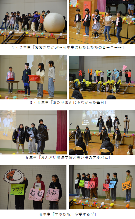 3月3日に6年生を送る会を行いました。低学年、中学年、そして5年生が準備や全体の進行等、堂々とした姿で各自の役割を果たしました。今の5年生は16人、萬歳小では人数の多い学年ですが、それでも様々な準備を進めるのは本当に大変だったことと思います。このように5年生をはじめ、各学年の頑張りが十分に感じられた6年生を送る会となりました。