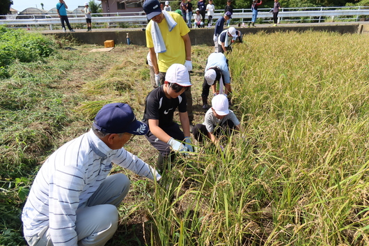 9月16日(火)に、ふれあい公園近くの田んぼをお借りして、稲刈り体験をしました。お米の先生の石毛さんやライオンズクラブの方々、地域コーディネーターのご協力のもと、子ども達は、鎌を使いながら丁寧に稲刈りをしていました。稲刈り体験を通して、手作業で行うことの大変さや米作りへの理解を深めることができました。コンバインにも乗せていただき、とても貴重な体験ができました。