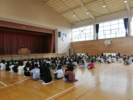 10月10日(金)に前期終業式を行いました。校長先生から、「先出し感謝」について話がありました。誰かの感謝の気持ちが、そばにいる人たちに広がり、感謝の輪ができあがる。その感謝のはじめの一歩が「先出し感謝」だという話でした。子どもたちは、学校だけではなく、家庭等、さまざまな場面での「ありがとう」について考えていました。