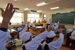 12月9日(火)に、5年生が、食農推進事業で農水産課と食育アドバイザーの方に、おにぎりとお味噌汁の作り方を教えていただき、調理実習をしました。調理の合間には、旭市が全国有数の野菜生産地であることについて学び、有意義な活動を行うことができました。