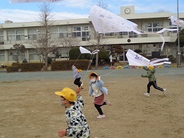 1年生が生活科で、たこを手作りし、今日はたこあげを楽しみました。風にのって空を舞うたこの様子を見て、元気な歓声があがりました。みんな夢中で、走り回っていました。