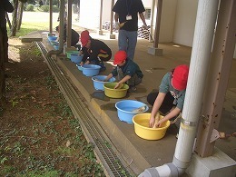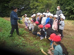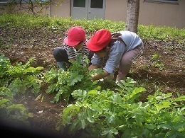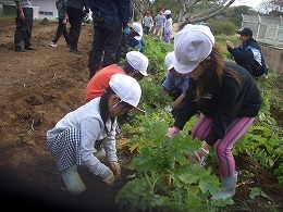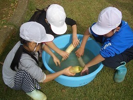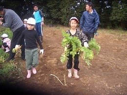 11月5日(水)に、1・2年生が、ふれあい交流会の豚汁に入れる大根の収穫を行いました。大根は真っ直ぐ植わっているので、垂直に引くと比較的簡単に抜くことができます。しかし、まだ小さい1年生は、力のいる作業だったかもしれません。 大根抜きの後は、PTA役員の皆さんが、すぐに調理に取りかかれるように、たらいでよく洗いました。 こうした体験を通じて、収穫の喜びや自然に感謝する心、職業に関する感心を高めていきます。