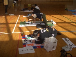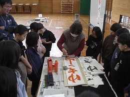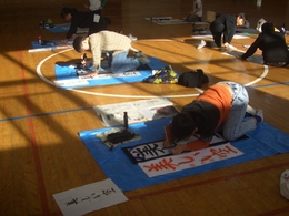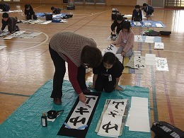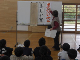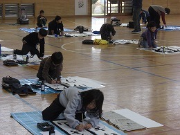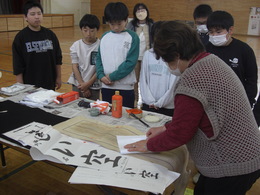 12月12日(木)に3・5年生の書き初め教室を行いました。今回、始めて書き初めに挑戦する3年生には、文字のバランスをとるためにつける折り目や墨のつけ具合まで丁寧に教えていただきました。 一文字一文字を形良く書くポイントとともに、大きく、伸び伸びと楽しんで書くという心の在り方についても教えていただきました。