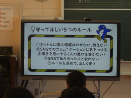 教室では、5つのルール(@ネットへの個人情報の掲載。ASNSでのコミュニケーションの配慮事項。B相手への思いやり。CSNSで知り合った人と合わない。Dルールの設定と正しい使い方。)について教えていただきました。