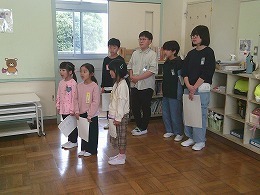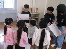 4月13日(月)に異学年交流の一環として、1年生が6年生に校歌を教えてもらいました。三つのグループに分かれて活動を行いました。1年生は元気な声で歌を歌うことができました。6年生は平仮名で書かれた校歌の歌詞カードをグループ別に用意し歌っているところを指さしたり、1年生の良い所を見つけて誉めながら活動できました。 こうした異学年交流を通して、先輩に感謝したり、後輩をいたわったりする気持ちや態度を育てていきます。